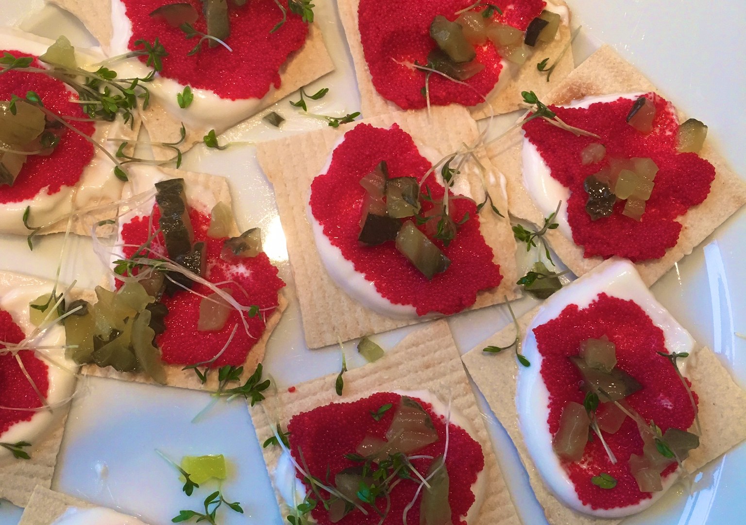 Flatbrød med kaviar, crème fraîche, sylteagurk og karse.