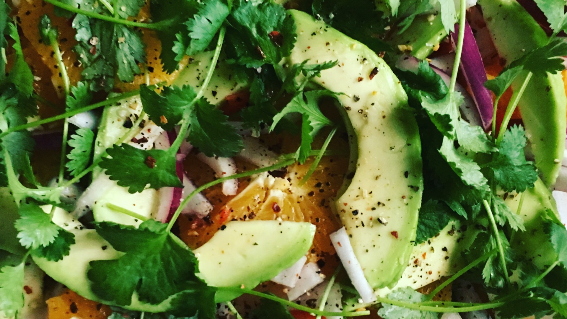 Skrell appelsiner og avokado og skjær i skiver. Bland med strimlet rødløk og koriander. Hell over saften av en halv sitron. Krydre med salt og pepper. Denne her kan du godt ha fetaost på også, for ekstra deilig smak av Middelhavet. Supergodt, jeg lover!