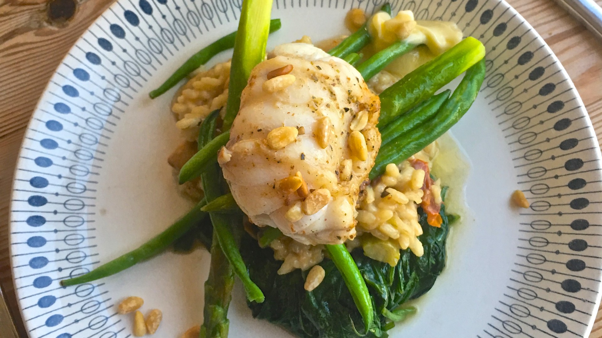 Legg en porsjon sautert spinat på hver tallerken, fortsett med sopprisotto, så grønnsaker, og breiflabbmedaljongene på toppen. Krydre med salt og pepper. Jeg slang på noen ristede pinjekjerner i tillegg, men det er på ingen måte noe must.