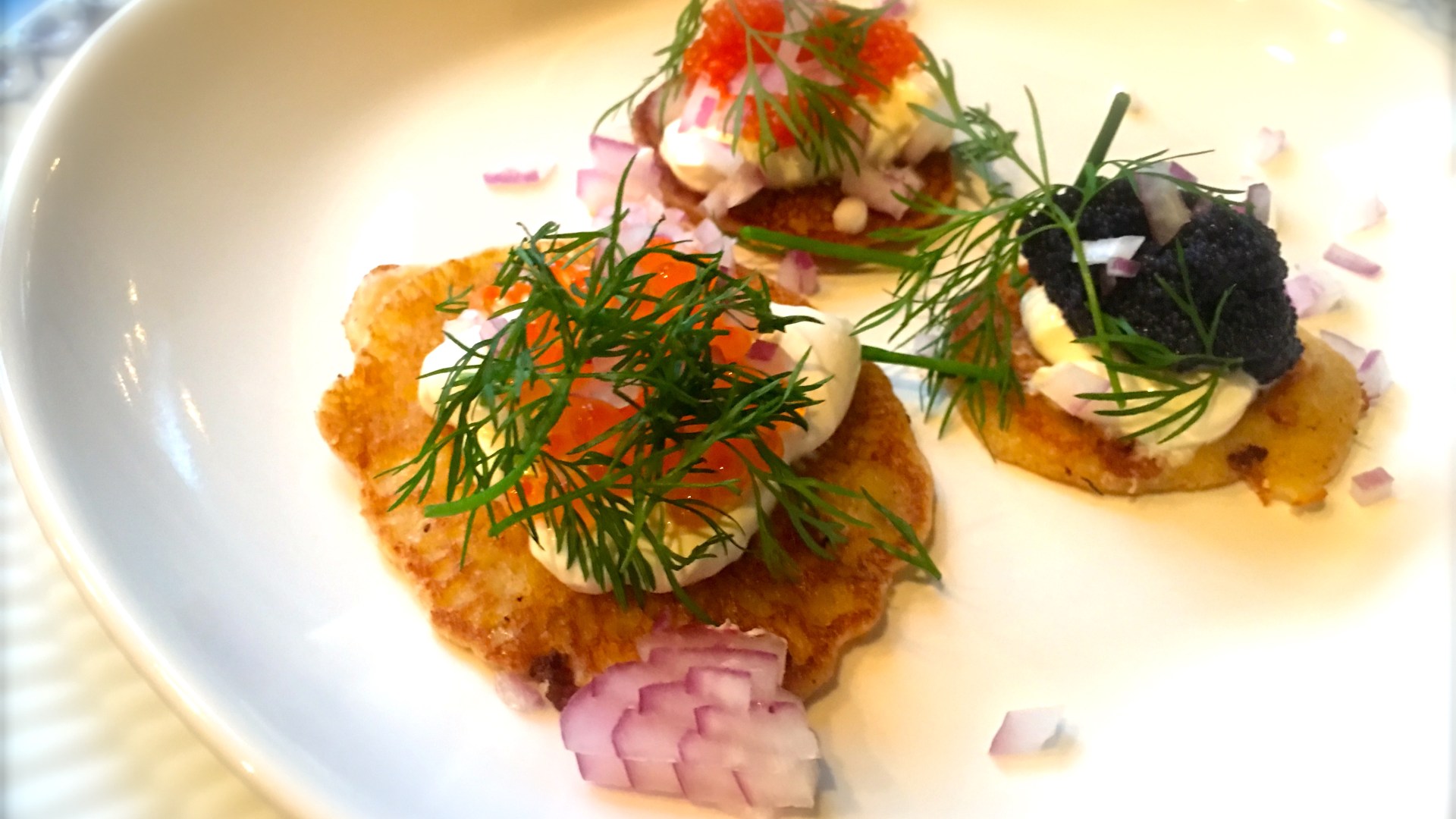 På hver blini legger du en dæsj crème fraîche og kaviar oppå. Jeg ga hver gjest tre blinis og serverte med rød og sort lodderogn og lakserogn. Oppå strør du finhakket rødløk, dill og gressløk. Også serverer du gode bobler til!