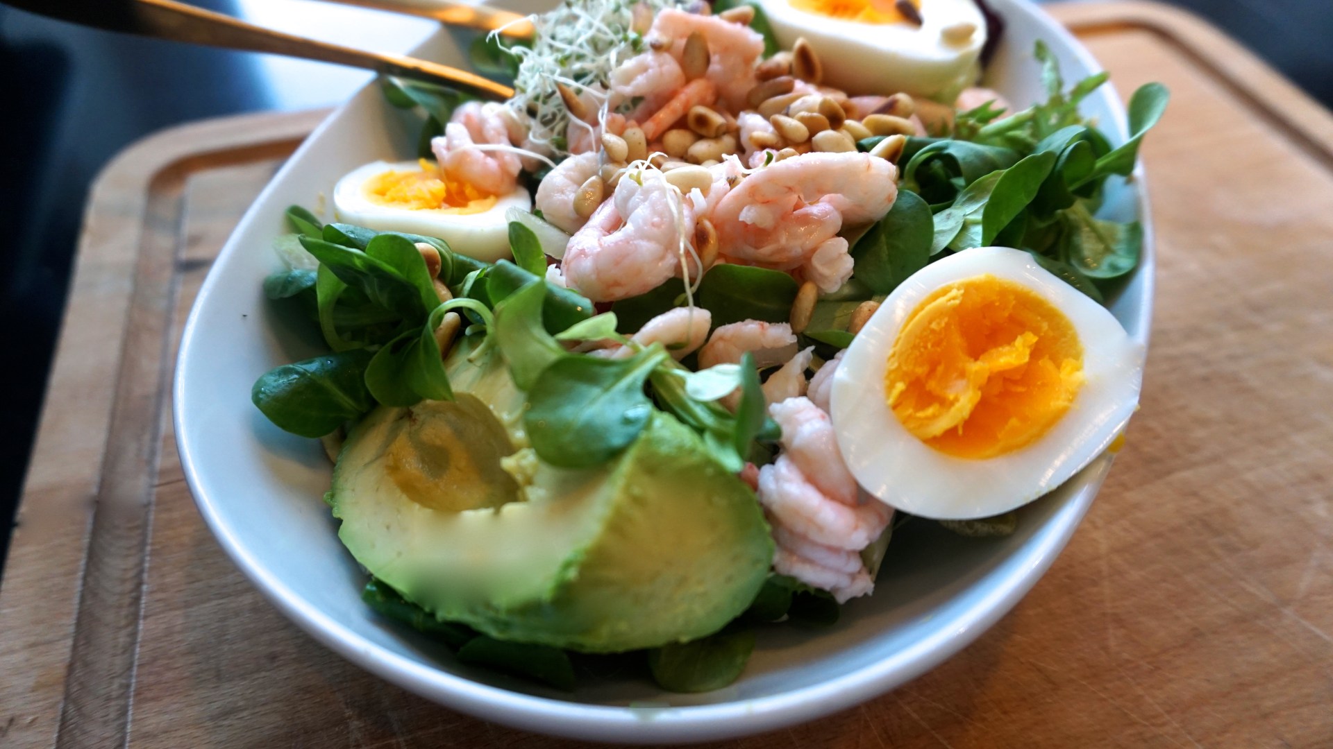 Slik gjør du det: Kok eggene i 6 minutter. Bland sammen dressingen, smak evt til med mer karri. Rist pinjekjerner i tørr panne. Skrell eggene og skjær i to, skrell og skjær opp avokado, bland alle ingrediensene sammen og ha verdens deiligste lunsj! Vil du at salaten skal mette mer, server godt brød eller rundstykker til.