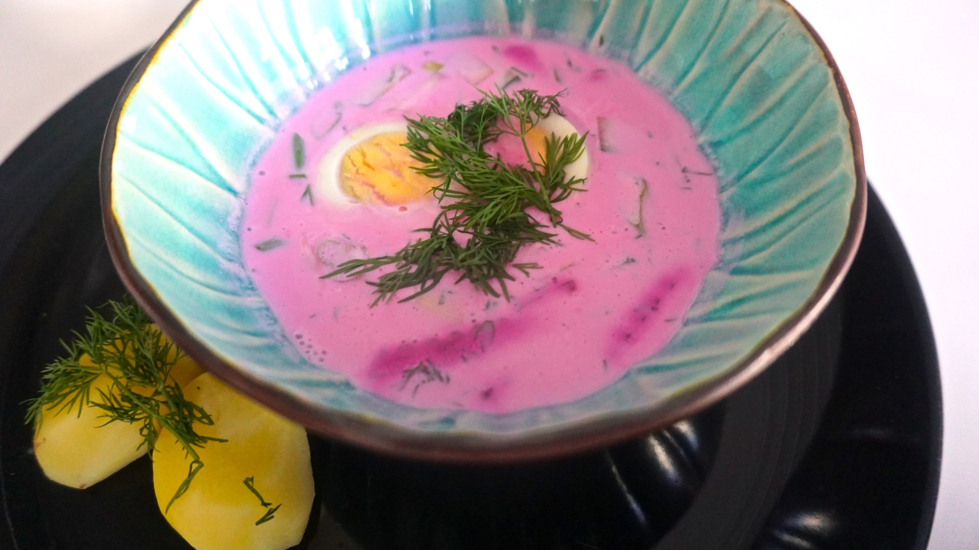 «Jeg SA jo at du måtte prøve litauisk mat», sier Simona og står der med det vakre gliset sitt og en tallerken med lekker, rosa suppe. På hennes språk heter denne retten Šaltibarščiai, og er en variant av russiske borsjtsj, som også er en type rødbetesuppe. Det er en skikkelig forsmak på sommeren, frisk, lett og deilig, og superenkel å lage. Serverer du suppen i vakre glass, blir den en nydelig forrett.