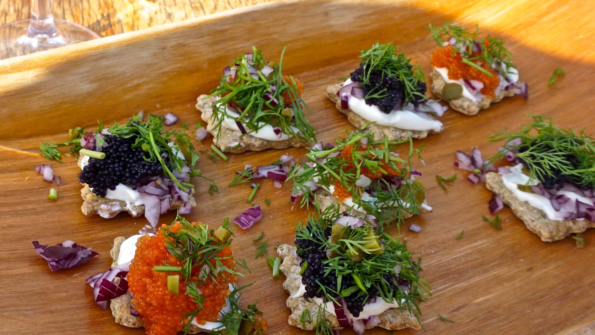 Ha kjeksene på et brett eller serveringsfat. Legg en klatt crème fraîche på hver kjeks og fyll på med rogn, hakket rødløk, sylteagurk og dill. Det er lurt å gi gjestene en serviett til serveringen. Spises i en munnfull.