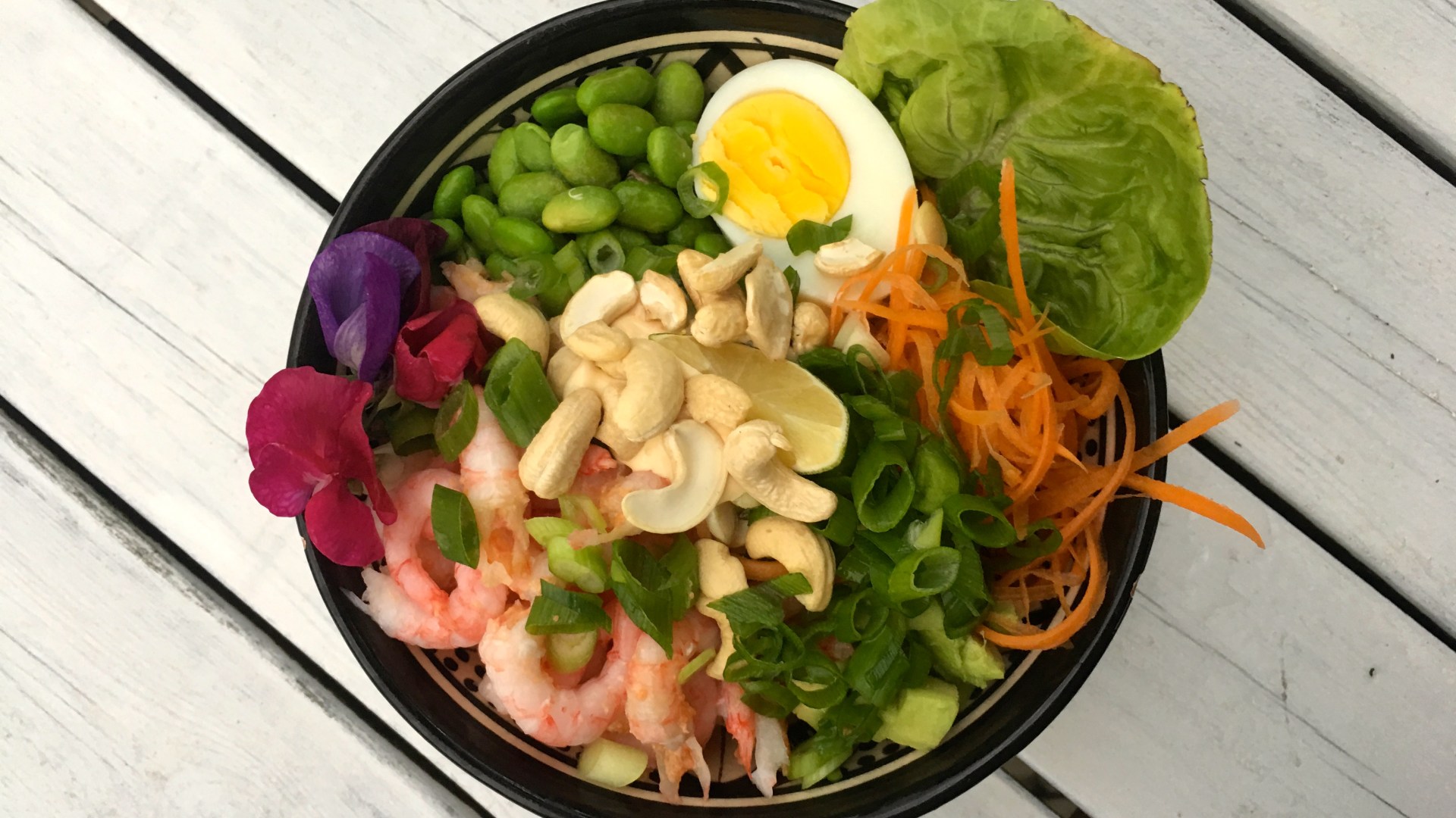 I bunnen har jeg lagt quinoa, på toppen revet gulrot, kokt egg, pillede reker, avokado, edamamebønner, vårløk, chilimajones og noen cashewnøtter. De spiselige blomstene vokser i hagen min, de er bare med for bildets skyld. Kokt quinoa kan du bytte ut med bønner, linser, grov ris, kikerter eller for eksempel nudler. Opp til deg! Rekene og egget kan du droppe om du ønsker en ren vegetarrett, det blir godt uansett. Grønnsaker velger du etter egen smak. Fjern majonesen om du er en surmaga superslanker, samme for meg. Dette er uansett så godt, så sunt, så Instagram-vennlig og så latterlig enkelt at det egentlig ikke skulle vært lov. Med andre ord: kjør på!