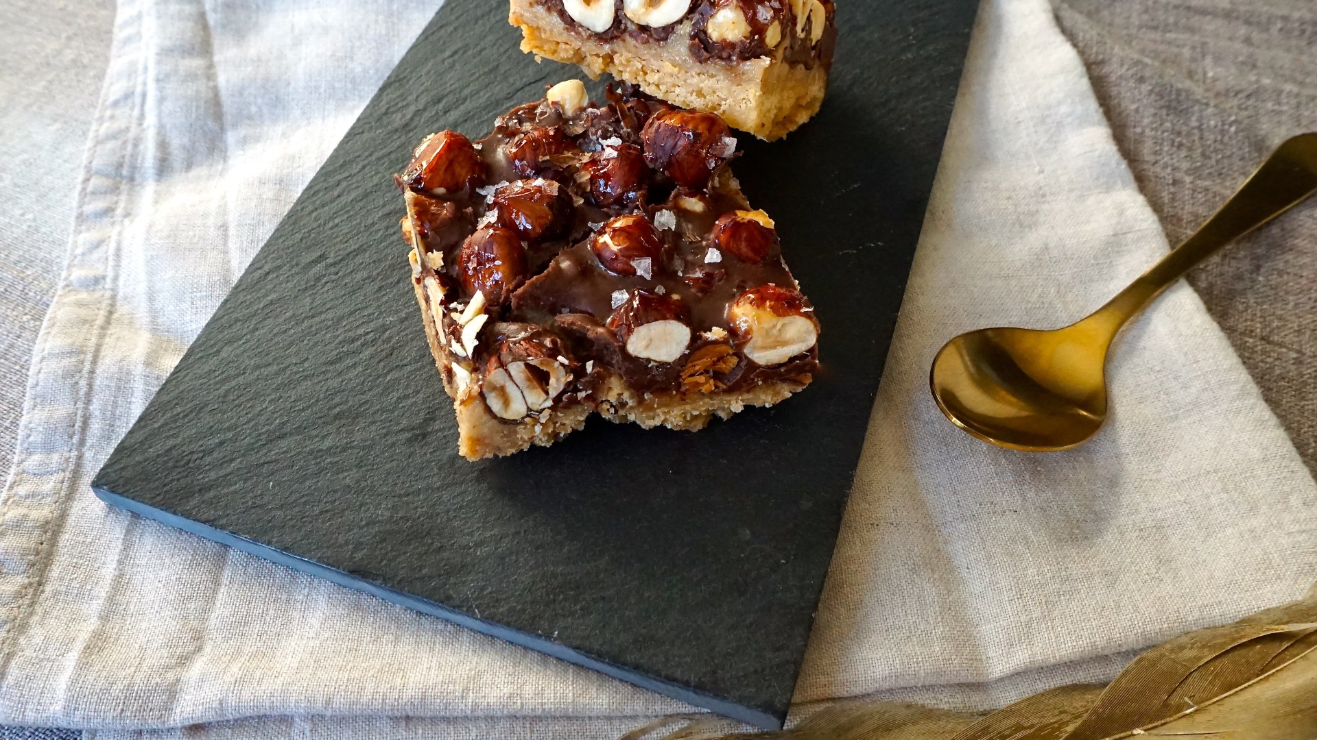 Og med det kan pepperkakene og sirupssnippene egentlig bare gå og legge seg. Disse godbitene har alt – søt karamell, sprø kjeks, mørk sjokolade og salte, glaserte hasselnøtter. Hva mer kan man ønske seg?
