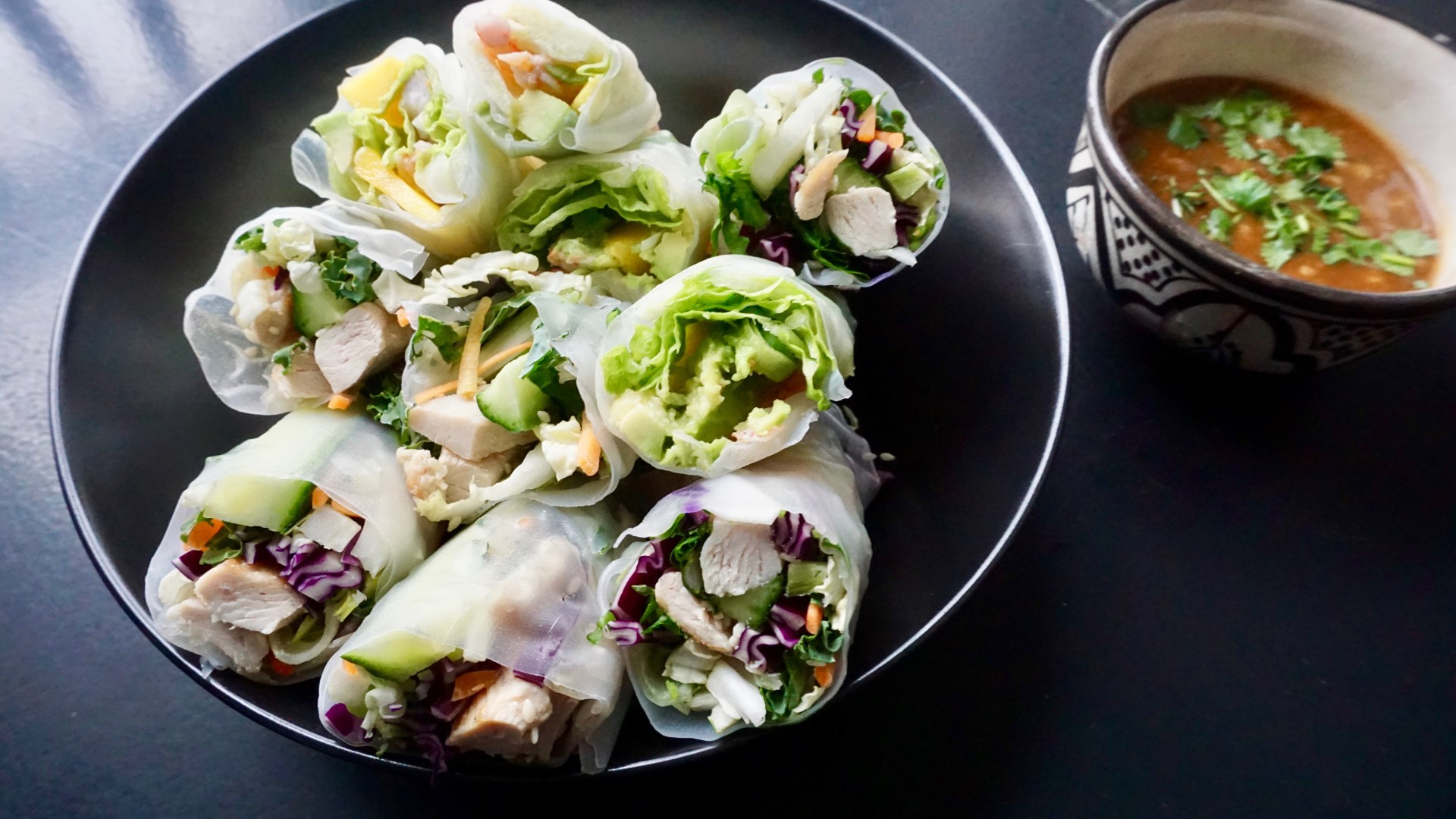 Denne gangen lagde jeg en versjon med reker, mango, avokado, koriander og kinakål, og en med kylling, grønnkål, pak choi, rødkål, gulrot og agurk. Klarer ikke å si hvilken som ble best.