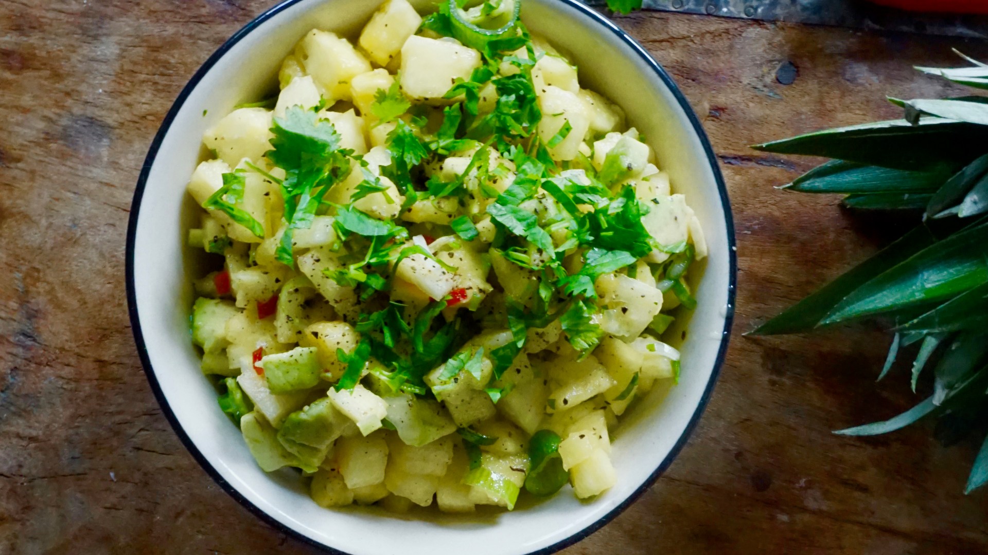 Skjær ananas og avokado i små terninger og ha i en bolle. Finhakk chili, korianderblader og vårløk og bland inn sammen med olje og sitronsaft. Smak til med salt og pepper. Du kan også ha granateple i salaten for litt ekstra krunsj og farge. God middag!