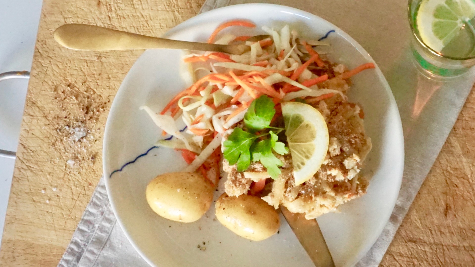 Serveres med kokte poteter og råkostsalat, eller bare med en grønn salat ved siden av. Smeltet smør er godt ved siden av.