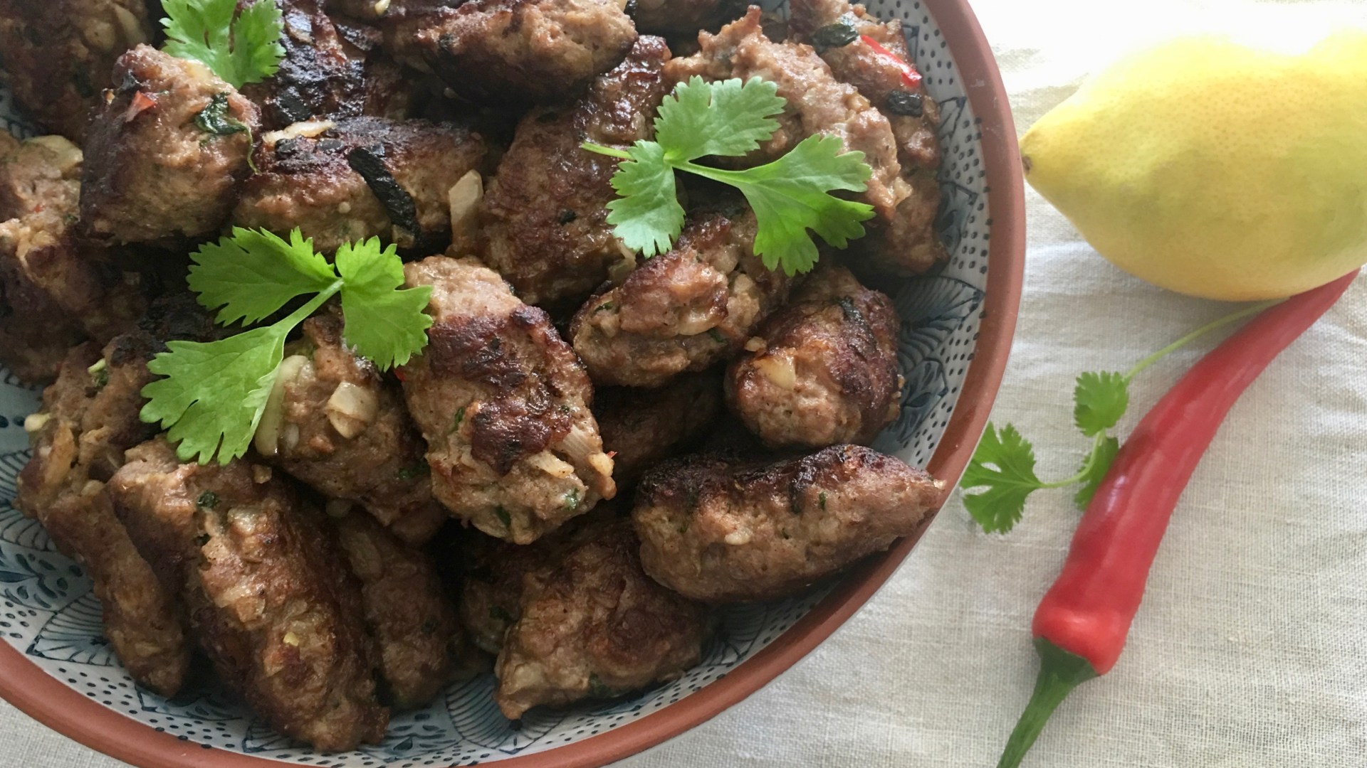 Finhakk chili, koriander løk og hvitløk. Ha alle ingrediensene i en bolle og bland godt sammen. La stå kaldt en stund om du har tid til det, gjerne helst en time. Form kjøttfarsen til små, avlange kjøttboller. Varm smør og olje i en stekepanne (når du bruker begge deler unngår du spruten fra panna) og stek kjøttbollene på middels varme. Du kan også legge dem på grillen.