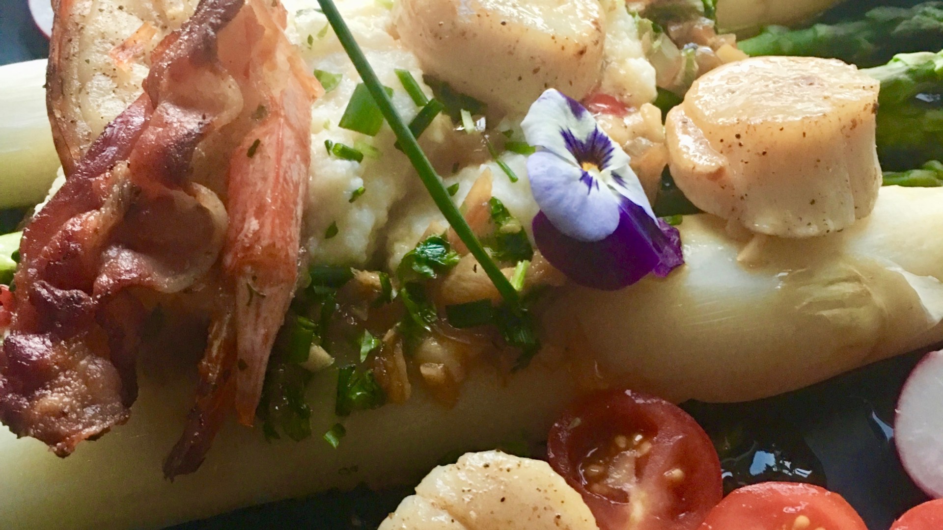 Kamskjell og asparges er perfekt sammen! Med en deilig sellerirotkrem og soyasmør blir dette en mettende rett med deilig umamismak. Vi flesket til med litt sprøstekt bacon og tigerreker attpå. Det er på ingen måte noe must. Med noen sprø grønnsaker ved siden av og friske urter har du uansett en fargerik rett som også gir litt krønsj. Du trenger ikke alle elementene for at dette skal bli skikkelig snadder. Bruk det du har av grønnsaker, urter og tilbehør.