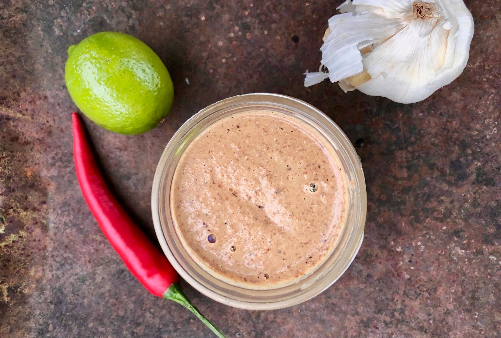 Varm sesamfrøene i tørr stekepanne og rist dem på middels varme til de begynner å poppe i pannen. Ha frøene over i en bolle og mal dem med stavmikseren. Ha i resten av ingrediensene (tilsett oljen litt og litt) og mal med frøene til du har en jevn dressing. Smak sausen til med sirup, soya, lime og salt til du har ønsket smak (mengdeberegningen overfor må du anse kun som forslag, lek litt med salt, sødme og syre her for å få det perfekt). Dersom dressingen virker veldig tykk og grøtete, tilsett litt kaldt vann til du har passe rennende konsistens. Hvis du vil ha en mildere saus, kan du tilsette et par spiseskjeer god majones. Enda sterkere: bruk en hel chili.