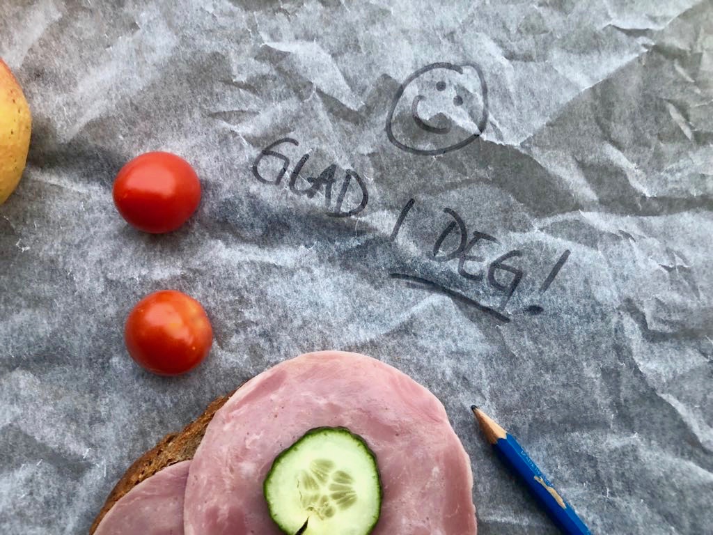 Vil du gjøre noe ekstra? Snik heller til deg den selvlagde matpakka og skriv «Jeg er glad i deg» på matpapiret. Det tar fem sekunder, og varmer minst like mye som agurkkunst. En helt vanlig klem fungerer også utmerket.