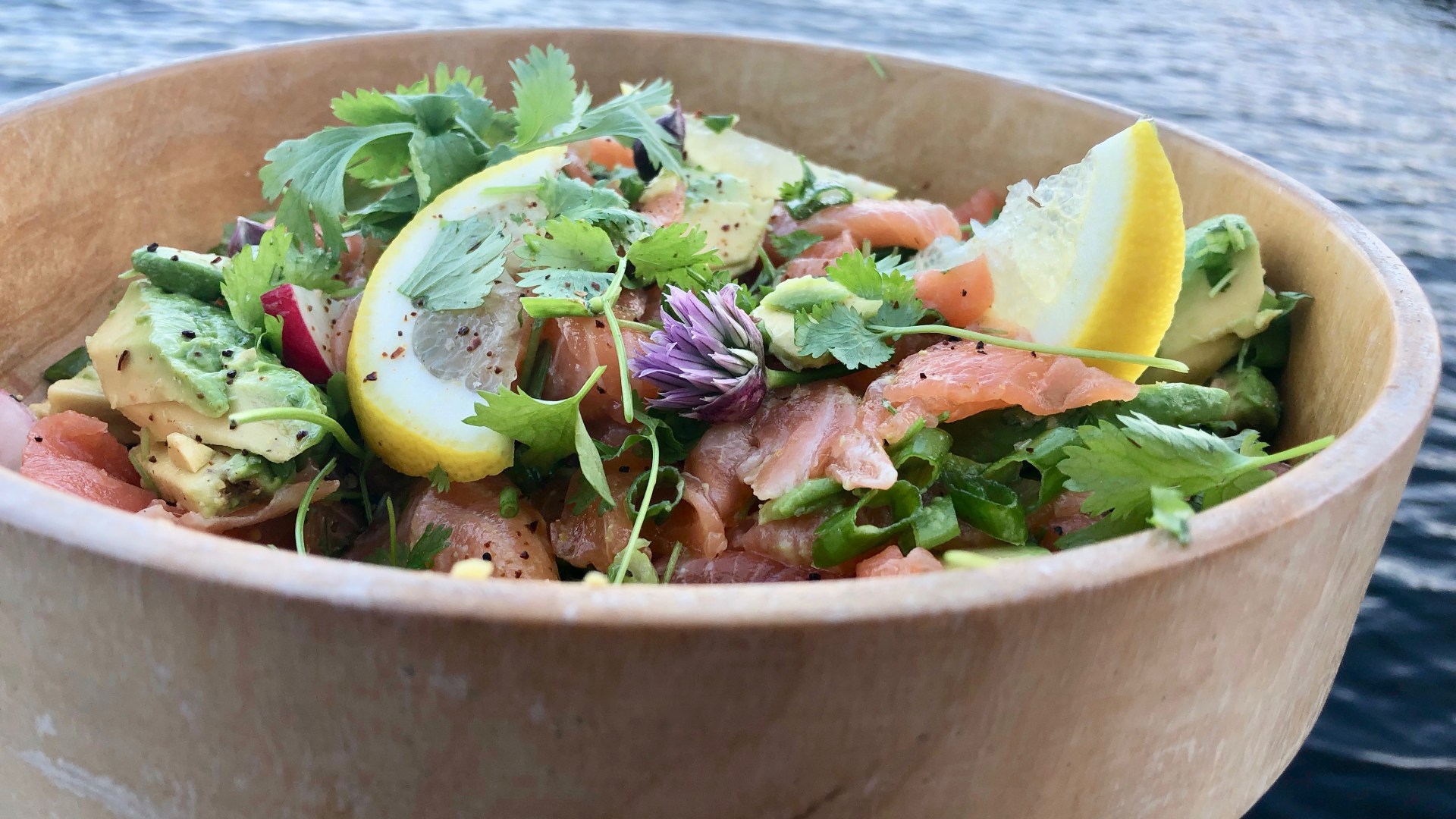 Skjær fisken, avokadoen og reddikene i skiver og vårløken i strimler. Bland inn sesamolje og sitronsaft. Krydre med koriander, flaksalt og pepper.